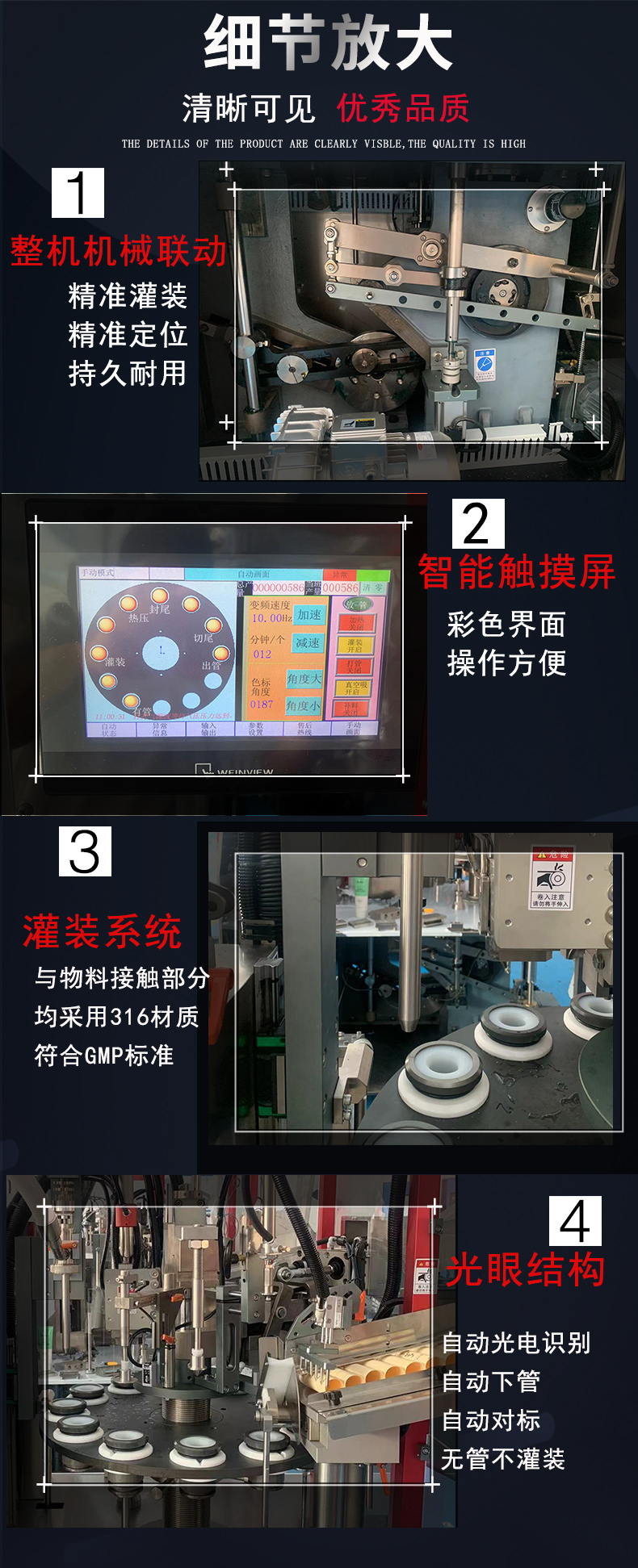 1、自動下管,填充加熱夾形成形(打碼)切尾,無管不充填。