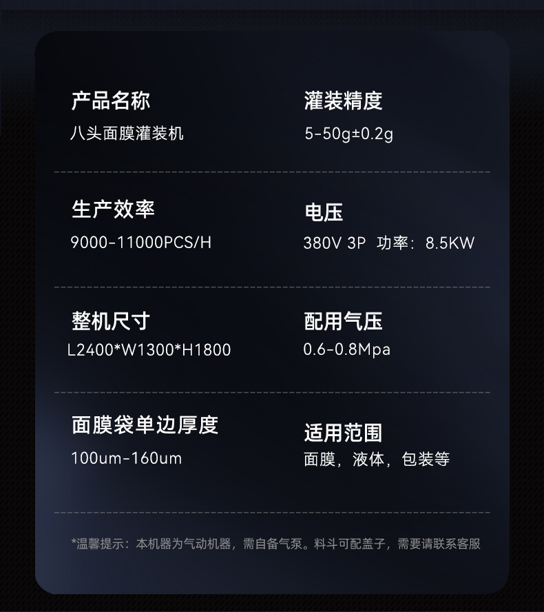 動作流程 | 自動下袋、自動充填、自動封口、打碼、成品輸出 |